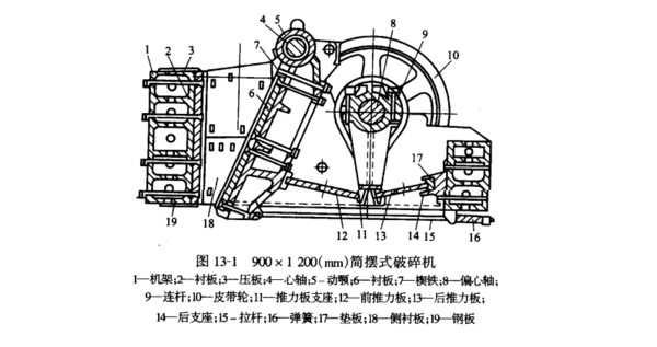 颚式破碎机介绍发表时间:2024-10-08 08:51 一、结构与工作原理 颚式破碎机具有结构简单、工作可靠、制造容易、维修方便等特点,是非金属矿加工中最常用的粗碎设备。 颚式破碎机通常由一个固定颚和一个动颚组成破碎腔,根据动颚的运动轨迹和特点,颚式破碎机可分为简摆式(双肘板或双推力板机构)颚式破碎机和复摆式(单肘板或单推力板机构)颚式破碎机。 图 13-1所示为 900x1 200(mm)简摆式破碎机。工作时,电机通过皮带轮 10 带动偏心轴 8转动,进而通过连杆9和前、后推力板12、13使动颚产生往复运动。进入固定颚与动颚之间(破碎腔)的物料,当动颚向左运动时受到其压挤而破碎;当动颚向右运动时物料靠自重向下运动。动颚每一个摆动周期,物料受到一次压挤作用并向下排送一段距离。物料从给人破碎腔开始,通常共受到3~4次以上的压碎作用后排出机外。 与简摆式颚式破碎机不同,复摆式颚式破碎机减少了连杆、后推力板和动颚心轴等部件使机构得到了简化(图 13-2)。动颚的运动轨迹不再是以心轴为中心的往复摆动,而是很复杂的轨迹,因而称为复摆式颚式破碎机。 二、性能特点 颚式破碎机靠动颚的运动进行工作,因此动颚的运动轨迹对破碎效果有较大的影响。简摆式颚式破碎机动颚上端的行程小于其下端,上端行程小对于破碎某些粒度和韧性较大的物料是不利的,甚至不足以满足破碎大块给料所需的压缩量,但下端行程较大有利于排料的通畅。除此之外,简摆式颚式破碎机动颚的垂直行程小,因此动颚的衬板磨损较小。复摆式颚式破碎机动颚上端和下端的运动不同步,交替进行压碎与排料,因而功率消耗均匀。其动颚垂直行程相对较大,这对于排料(特别是黏性及潮湿物料)有利,但衬板的磨损相对较大。总之与简摆式颚式破碎机相比,复摆式颚式破碎机具有结构紧凑、机器质量较轻、生产能力较大等特点。因此复摆式颚式破碎机得到越来越广泛的应用。 近年来,通过利用各种优化方法对各种颚式破碎机的结构进行了改进,使其效率得到了不同程度的提高。特别是对破碎腔的优化设计,提高了设备的处理能力,改善了破碎产品的粒度分布,减少了衬板的磨损。
